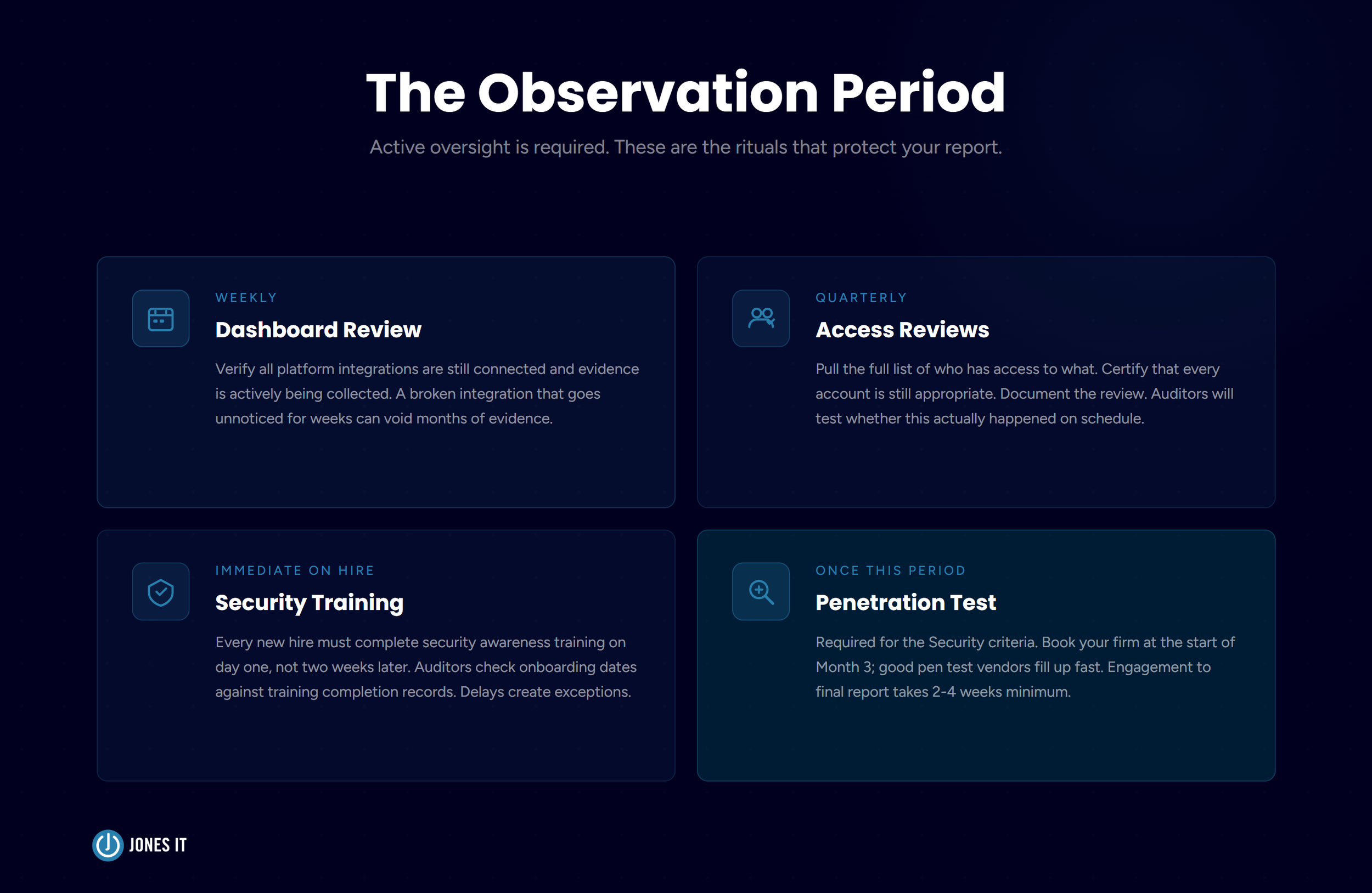 Months 3-5: Observation period with continuous evidence collection, penetration test, and operational rituals.