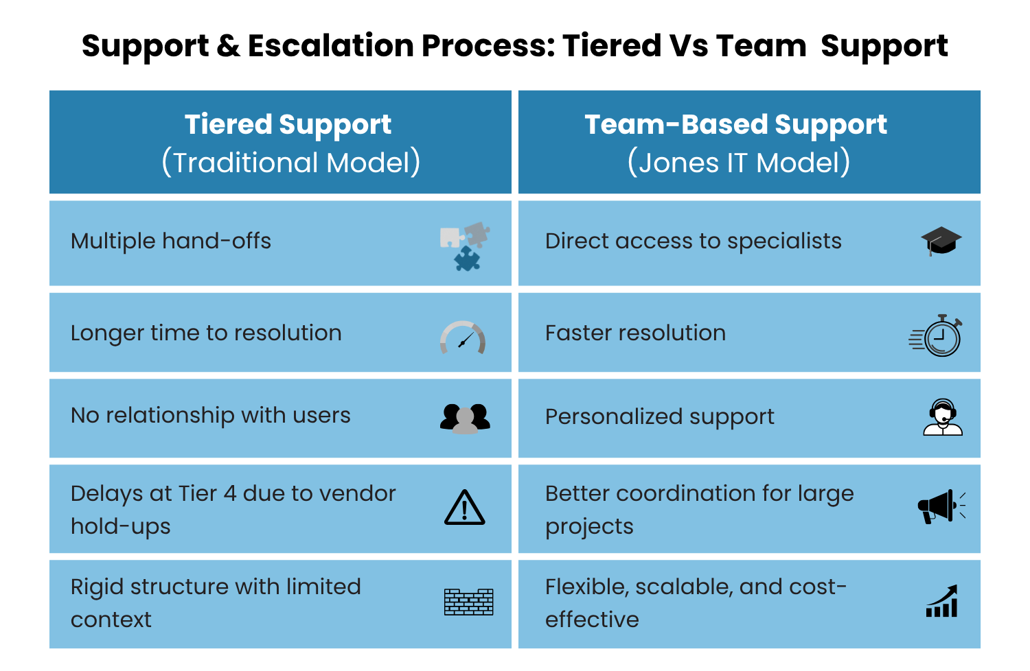 In the highly competitive MSP market, Jones IT distinguishes itself through its unique approach to pricing, support, and service delivery. By prioritizing transparency, flexibility, and personalized solutions, Jones IT addresses the common pitfalls of the traditional tiered service models that are rigid, obscure, and impersonal.